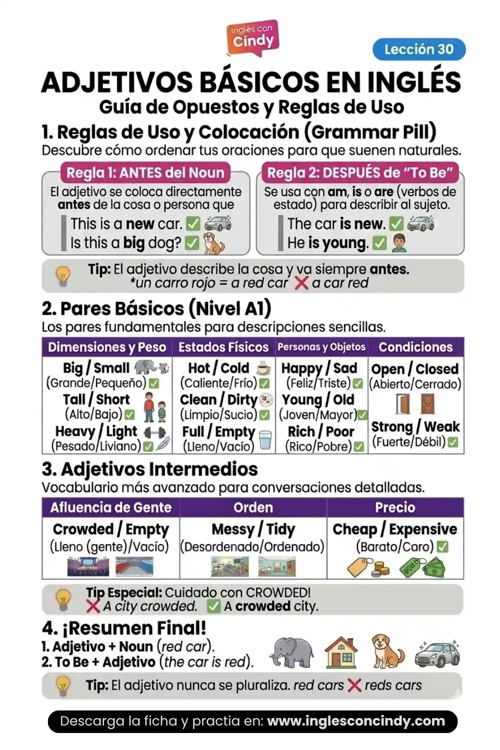 📝 Adjetivos Básicos en Inglés: Opuestos y Reglas de Uso
