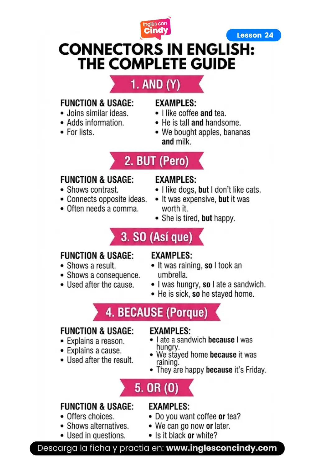 Guarda esta ficha completa de la Lección 24. Aquí tienes los usos clave, reglas y ejemplos prácticos de los conectores (and, but, so, because, or) en una sola imagen.
