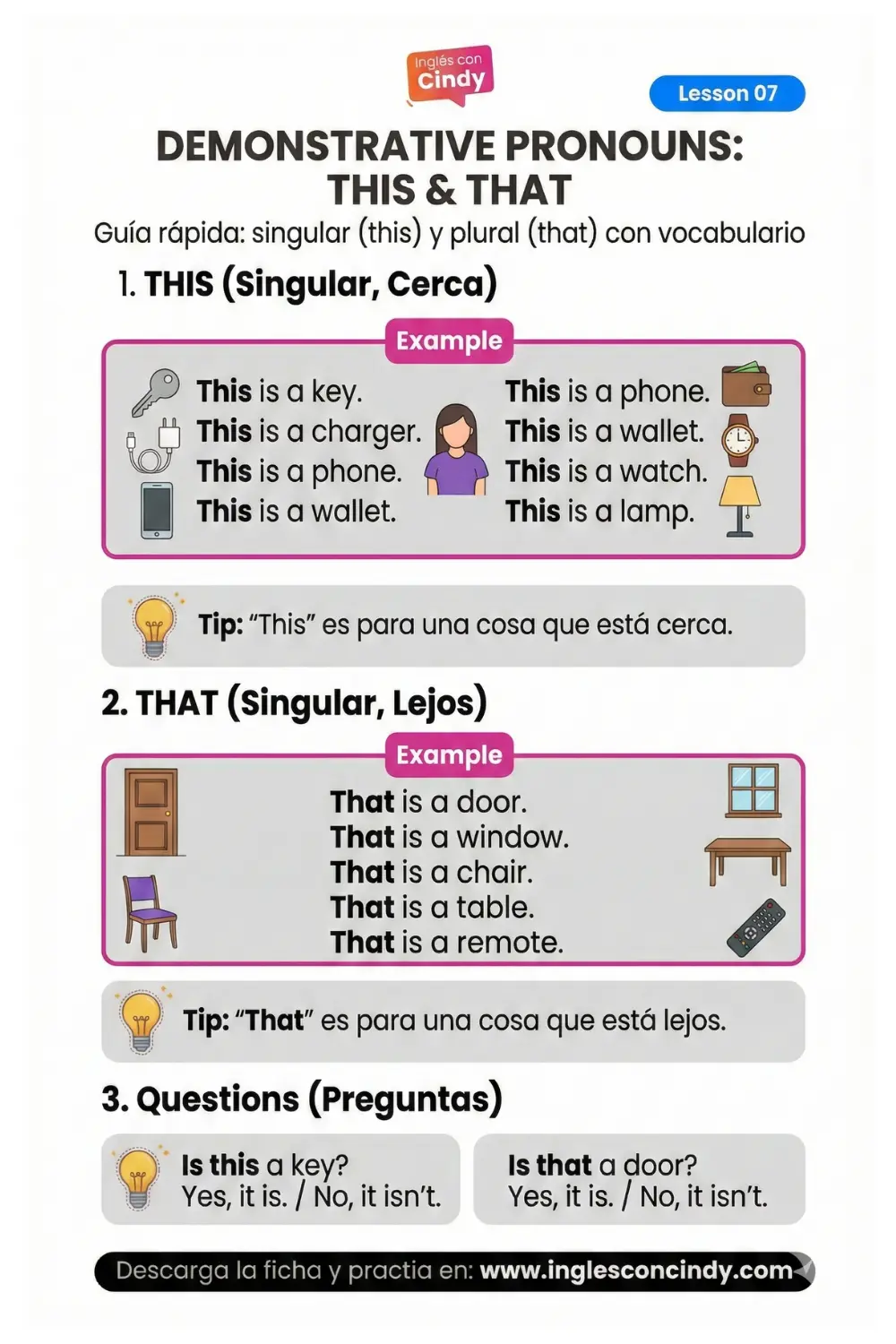 A continuación, encontrarás una lista completa de vocabulario. Lee cuidadosamente los ejemplos; verás que utilizamos tanto «This» como «That» para cada objeto, dependiendo de la situación.