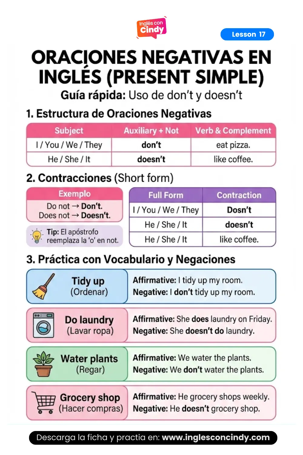 Guarda esta ficha de estudio de la Lección 17 para no olvidar la regla de Don’t y Doesn’t en tus oraciones.