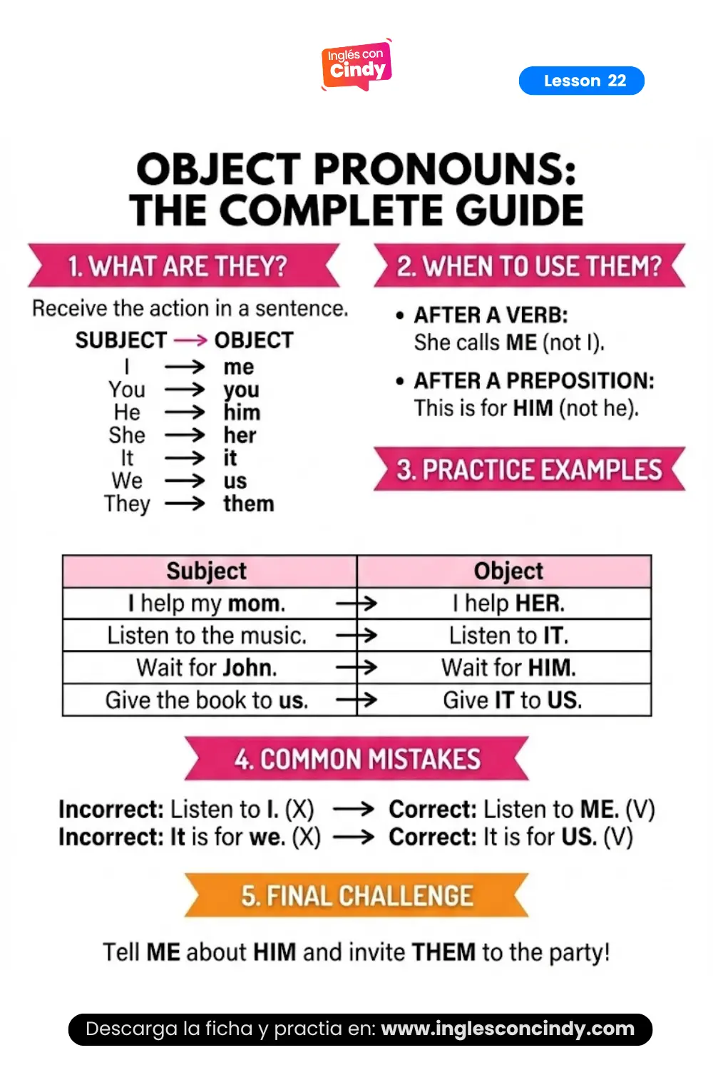 Guarda esta ficha completa de la Lección 22. Aquí tienes la tabla comparativa y los ejemplos clave de me, you, him, her, it, us y them en una sola imagen.
