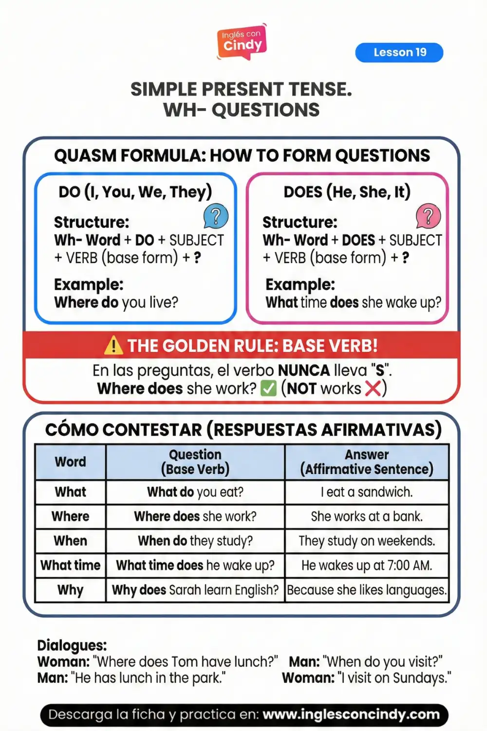 Guarda esta ficha de estudio de la Lección 19 para repasar la estructura QUASM, el uso de Do/Does y la Regla de Oro del verbo base.